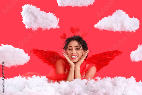 Fototapeta premium Young African-American woman dressed as Cupid in clouds on red background....