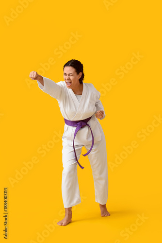 Obraz premium Young African-American woman practicing karate on yellow background