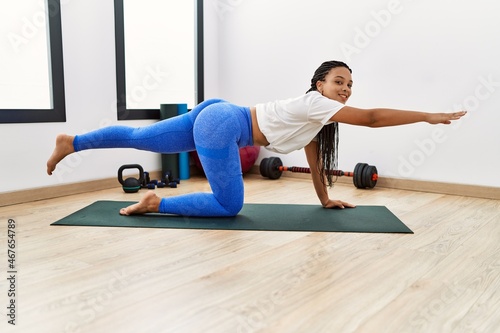 Fototapeta premium Young african american woman smiling confident stretching at sport center