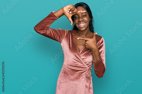 Fototapeta premium Young african american woman wearing sexy party dress smiling making frame...