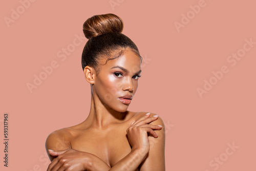 © Julia, Obraz premium Young African American Woman with Perfect healthy smooth Skin touches her shoulders with her hand and looks at the camera. isolated. colored gentle background. Fashion Portrait beautiful black woman.
