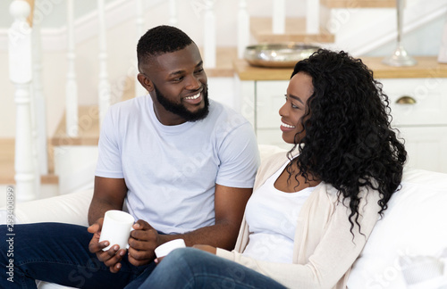 © Prostock-studio, Fototapeta premium Young african family relaxing at home with cup of coffee