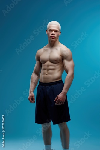 © Iryna, Fototapeta premium Young african male athlete with defined muscles posing on blue background