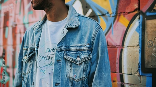 © Kenny, Fototapeta premium Young african male in denim jacket standing against colorful graffiti wall