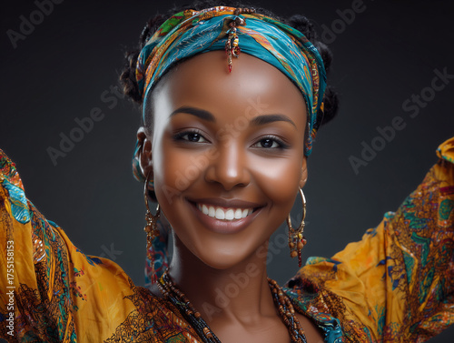 © Atlantis, Fototapeta premium Young african woman smiling wearing colorful headscarf and jewelry