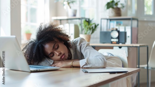© ds17, Obraz premium Young African woman with curly hair resting on a desk in a modern office. A laptop and notebook are visible on the table. Indoor setting with plants in the background.