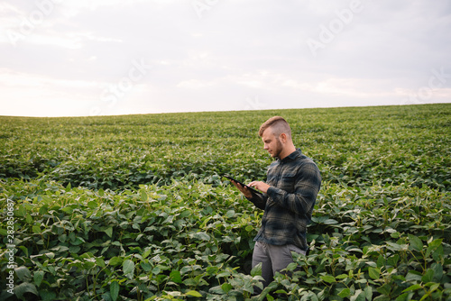 Fototapeta premium Young agronomist holds tablet touch pad computer in the soy field and...