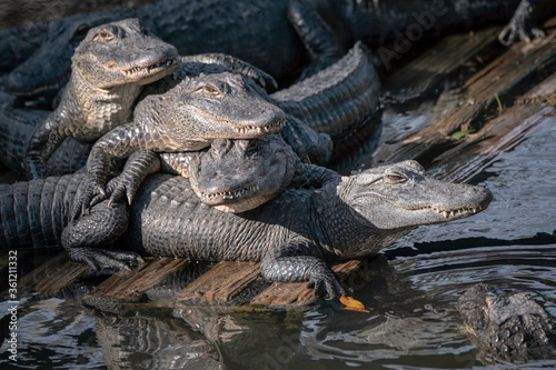 © Lori Labrecque, Obraz premium Young alligators stacked on top of each other soaking up the sun while floating on a dock