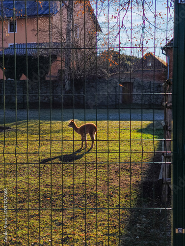 © alenagurenchuk, Naklejka premium Young alpaca standing backlit in a grassy enclosure at blatna castle, czechia. Observing through a fence