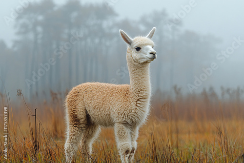 © Design Adelsa, Fototapeta premium Young Alpaca Stands in Foggy Field