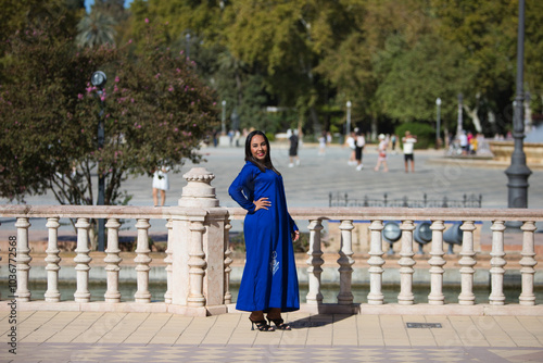 Fototapeta premium young and beautiful moroccan woman in blue abaya, typical arabian costume, walking along the canal in the square of spain in Seville, a world heritage site, on a sunny day. Travel concept.