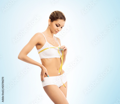 Naklejka premium Young and fit woman holding a measuring tape