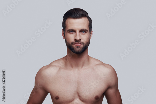 © G-Stock Faces, Fototapeta premium Young and handsome. Handsome young man looking at camera and smiling while standing against grey background