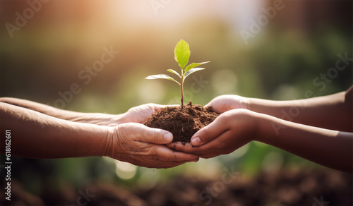 © Aziz, Naklejka premium young and old people holding plant.