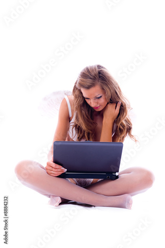 © zzzdim, Naklejka premium Young angel on a laptop - isolated over a white background