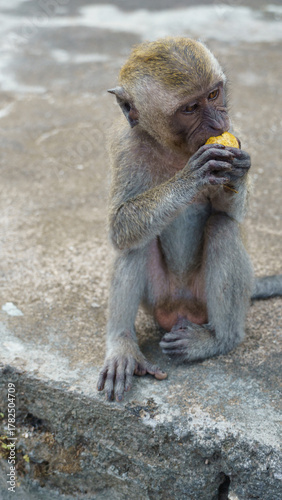 Naklejka premium Young ape munching, Juvenile monkey inspecting yellow fruit Nusa Penida Kelingking Beach Bali