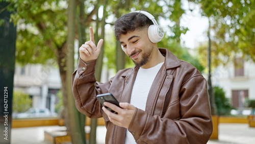 Fototapeta premium Young arab man smiling confident listening to music and dancing at park