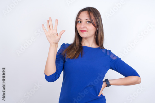 © Roquillo, Fototapeta premium Young arab woman wearing blue dress over white backgtound showing and pointing up with fingers number five while smiling confident and happy.