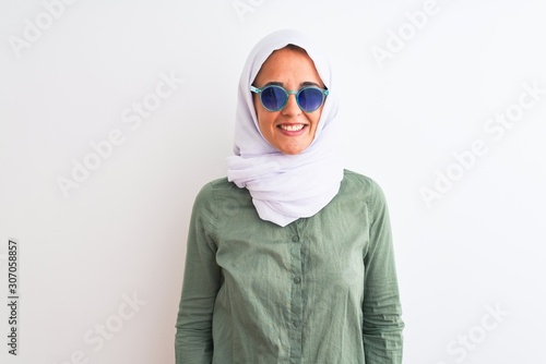 Obraz premium Young Arab woman wearing hijab and summer sunglasses over isolated background with a happy and cool smile on face. Lucky person.