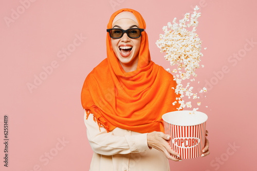 Obraz premium Young arabian muslim woman in 3d glasses wear orange abaya hijab watch movie film hold bucket toss up popcorn in cinema isolated on plain pink background. Uae middle eastern islam religious concept.