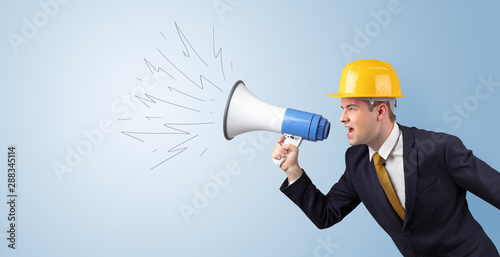 Fototapeta premium Young architect constructor yelling with megaphone and copyspace
