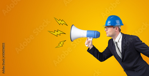 Fototapeta premium Young architect constructor yelling with megaphone and copyspace