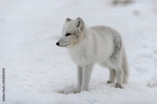 © Alexey Seafarer, Fototapeta premium Young arctic fox in winter tundra. Grey arctic fox puppy.
