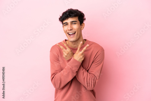© luismolinero, Obraz premium Young Argentinian man isolated on pink background smiling and showing victory sign
