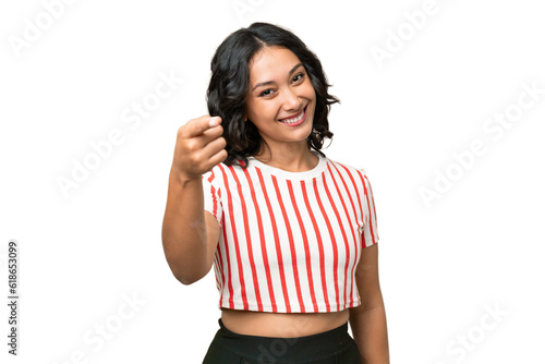 Fototapeta premium Young Argentinian woman over isolated background points finger at you with a confident expression