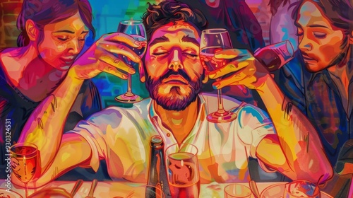 © vardan, Fototapeta premium Young armenian funny man with beard and open eyes standing at table making toast with cup of wine