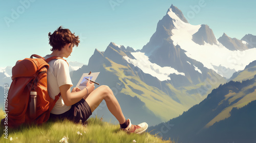 Naklejka premium Young artist sketching mountains in a serene landscape