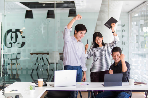 Obraz premium Young Asia freelance groups are helping to design products and use computers...