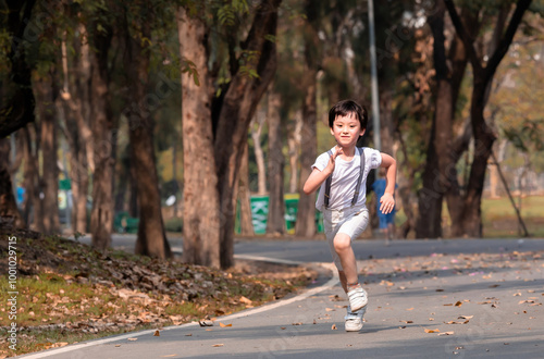 Fototapeta premium Young Asian boy running energetically down a tree-lined path in a park, capturing a playful and active moment outdoors. carefree expression reflects excitement and freedom to enjoy fresh air outdoor