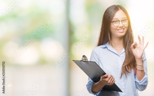 © Krakenimages.com, Obraz premium Young asian business woman holding clipboard over isolated background doing ok sign with fingers, excellent symbol