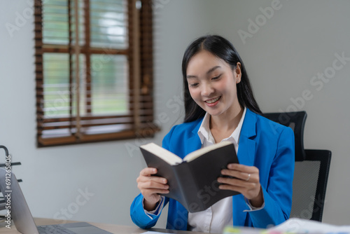 Fototapeta premium Young Asian business woman sitting working in modern office. Asia business...