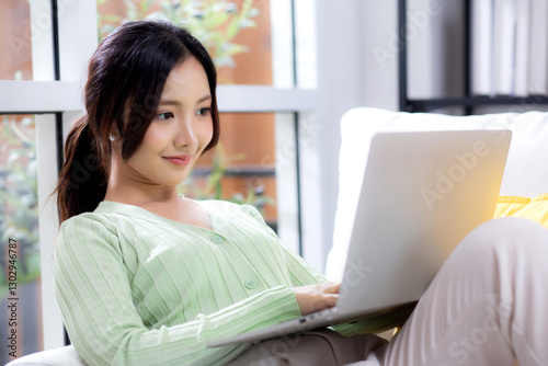 © NT_studio, Naklejka premium Young asian business woman working with laptop sitting on sofa in home office, businesswoman using on notebook in living room at home, woman relax with using laptop to social online, business concept.