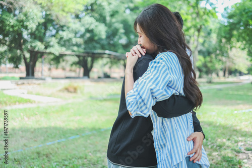 Naklejka premium Young Asian Couple Hugging Outdoors in Park on a Sunny Day, Joyful Hug...