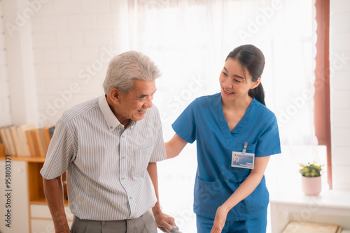 Obraz premium young asian female nurse care giver helping asian senior old man with...