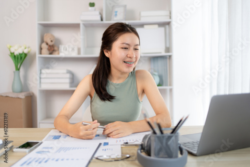 © Puwasit Inyavileart, Fototapeta premium Young Asian female student watching teacher's live performance or video call on laptop in classroom at home, Conversations with teachers and classmates, Online learning, Study at your own home.