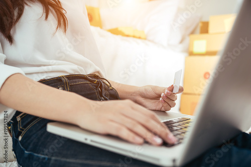 Naklejka premium Young asian girl is freelancer with her private business at home office,...