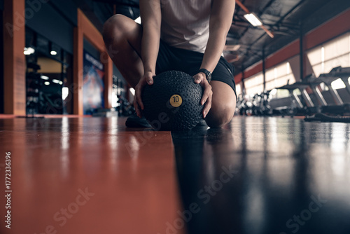 © Thanumporn, Fototapeta premium Young Asian man doing fitness workout with med ball in gym.