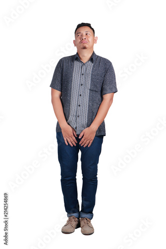 © airdone, Fototapeta premium Young Asian man wearing batik shirt crying, standing. Isolated on white