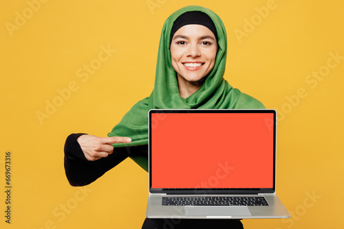 Naklejka premium Young asian muslim IT woman in green hijab abaya black clothes work use point on blank screen laptop pc computer isolated on plain yellow background People uae middle eastern islam religious concept