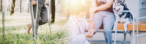 © ARMMY PICCA, Fototapeta premium young asian physical therapist working with senior woman on walking with a walker