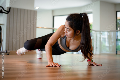 © Near, Fototapeta premium young Asian woman doing push ups in the gym