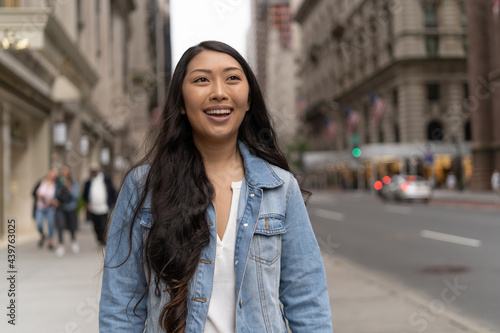 © blvdone, Fototapeta premium Young Asian woman in city walking street smile happy face