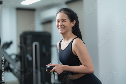 Obraz premium Young asian woman in gym holding dumbbell and performing squat exercise for...