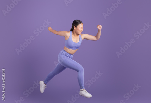 Obraz premium Young asian woman in sportswear running over purple studio background, free...