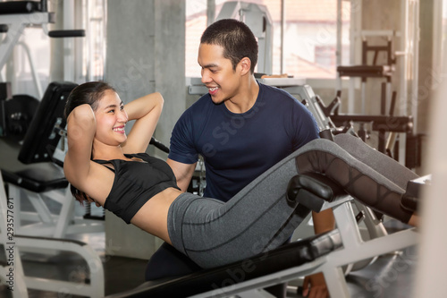 © Suthiporn, Obraz premium Young Asian woman in sportswear training sit up with male trainer at fitness gym.