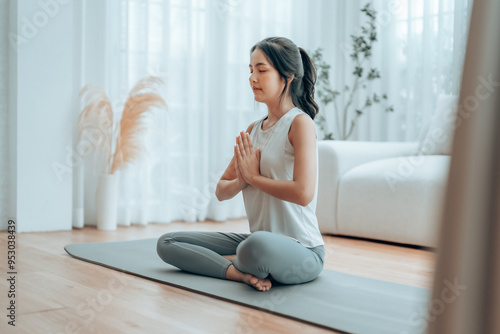 © Monster Ztudio, Naklejka premium Young Asian woman meditating in lotus position at home, sitting on the floor in fitness clothing. Breathing workout to achieve relaxation, peace and mindfulness
